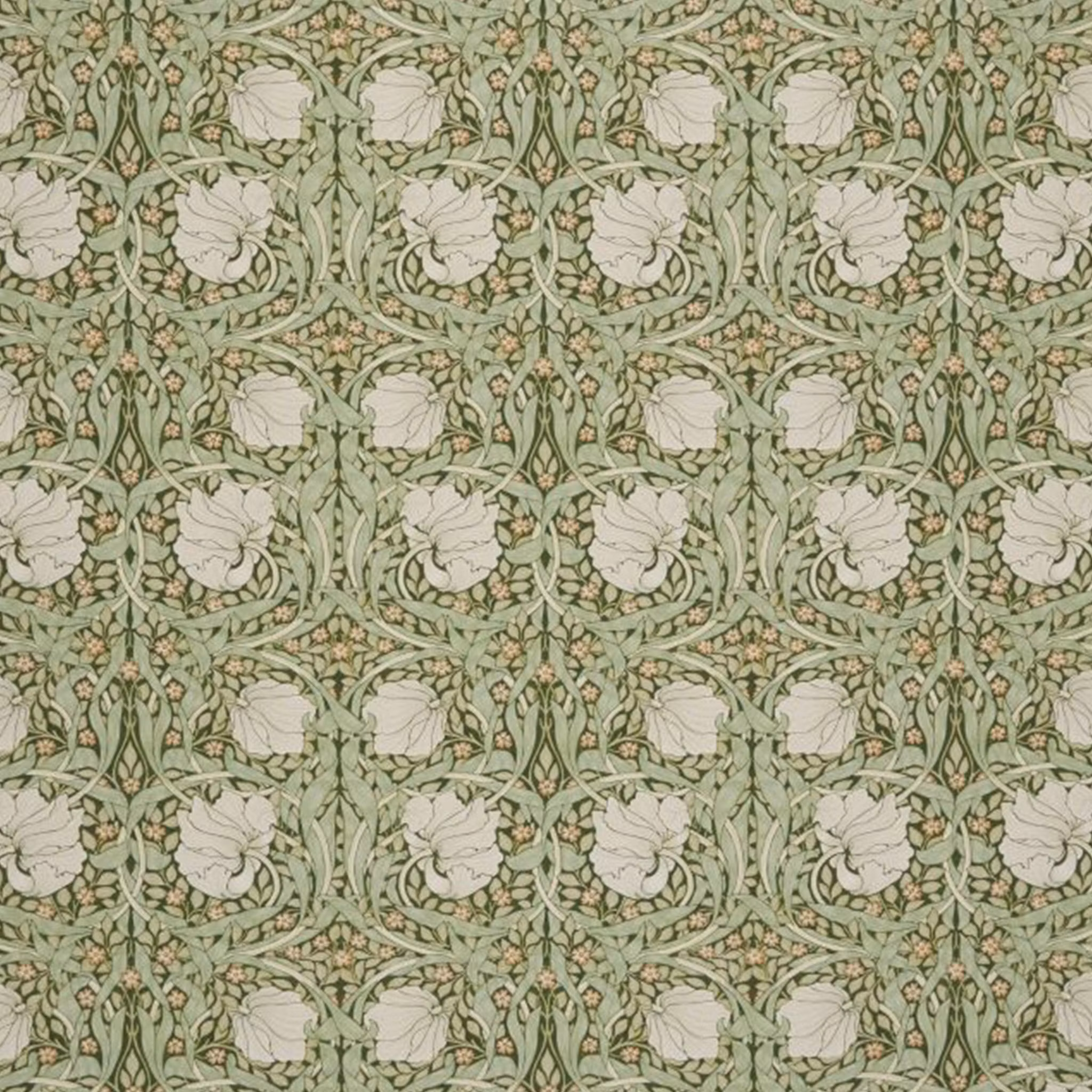 En måttbeställd gardin i ett av William Morris mest älskade mönster – Pimpernel, designad 1876. Med sina virvlande växtrankor och mjuka blommor skapar tyget en både livfull och romantisk känsla i rummet. Det var Morris personliga favorit, och prydde matsalen i hans hem Kelmscott Manor i Oxfordshire.