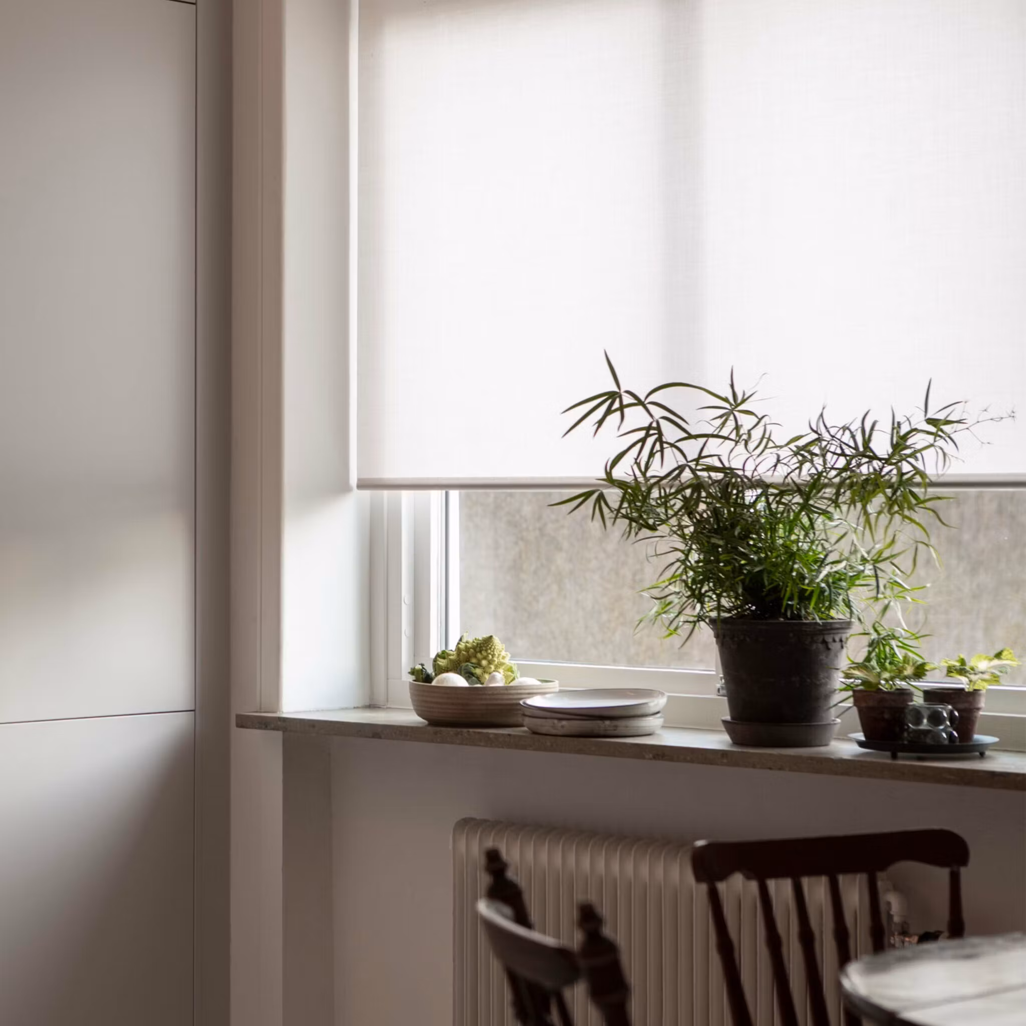 En stilren rullgardin i ljusfiltrerande väv, som sys på beställning enligt dina mått i Sverige.