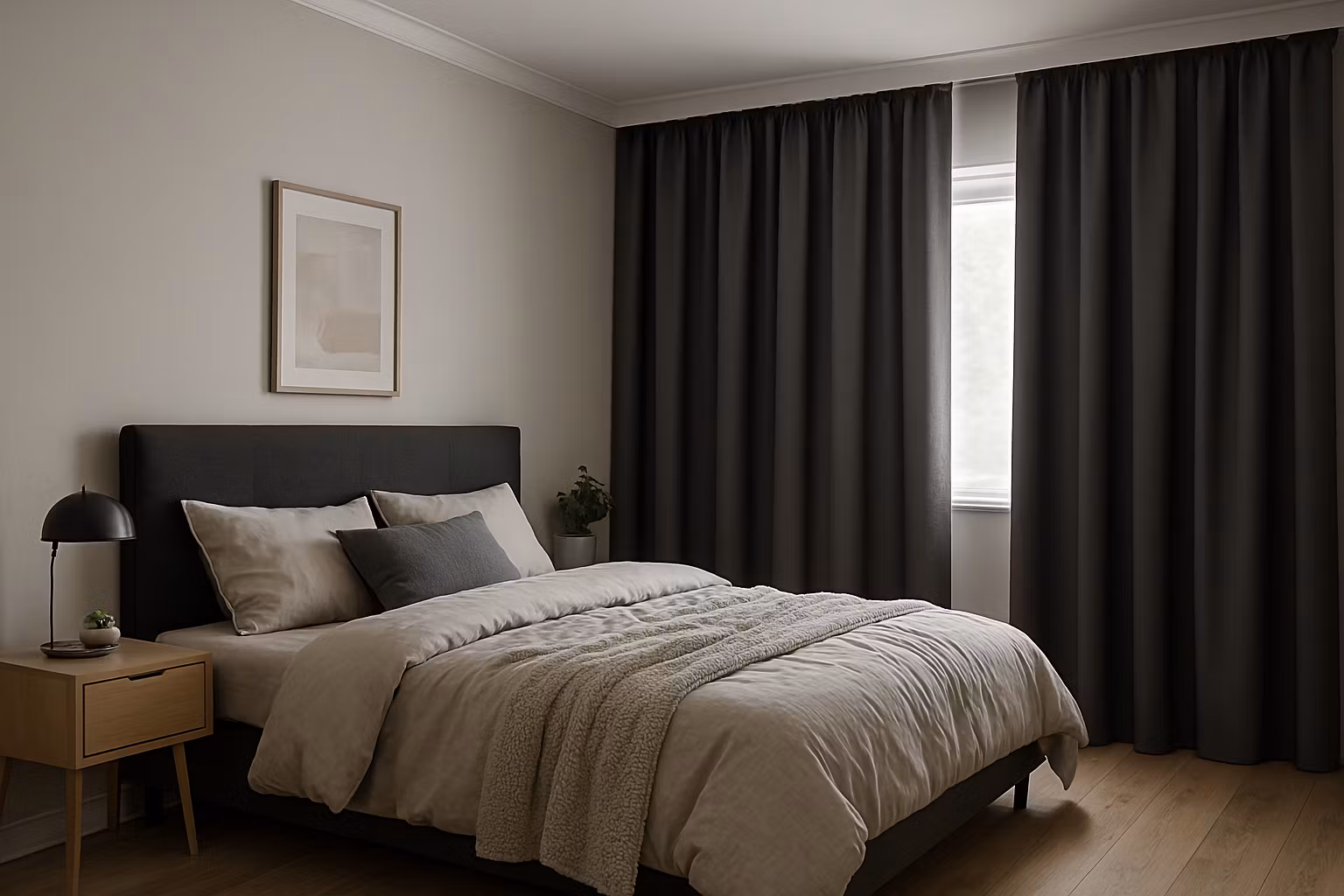 En mörkläggande gardin i högkvalitativt linnetyg som vi skräddarsyr enligt dina mått i vår ateljé i Göteborg, Sverige. Tyget ger upp till 90% mörkläggning och skapar en behagligt dämpad atmosfär i rummet – perfekt för sovrummet där du vill ha ro och vila, utan att kompromissa med den naturliga och luftiga känslan som linne ger.